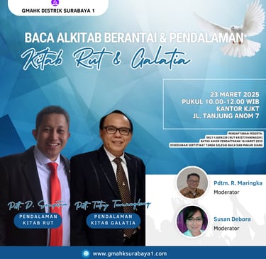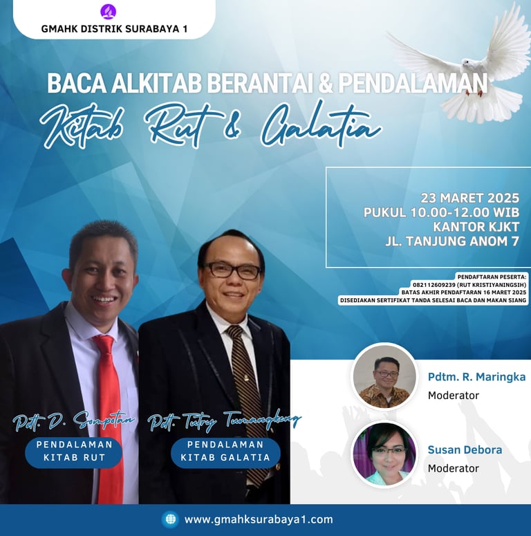 Pembahas Kitab Rut: Pdt. D. Sompotan, Ketua Distrik Surabaya 1 dan Pembahas Kitab Galatia Pdt. T. Tumangkeng, Sekertaris Eksekutif Konfrens Jawa Kawasan Timur. Sedangkan yang bertugas sebagai Moderator dalam acara ini adalah Pdtm. Royke Maringka dan Susan Debora. Pendaftar dan kehadiran dalam acara mencapai 53 orang peserta ditambah dengan beberapa orang panitia dan tamu yang bertugas dan datang melihat acara ini. Dimulai Pukul 10.00 WIB dan berakhir Pukul 12.00 WIB ternyata waktunya tidak cukup harus lebih panjang lagi. Setelah semua peserta selesai membaca Alkitab per sesi dalam kelompok masing-masing, Pendeta kemudian memberikan pendalaman dan masuk ke ruang tanya jawab. Sangat menarik dan seru membaca mempelajari Alkitab sebagaimana terangkum dalam link video dibawah ini: