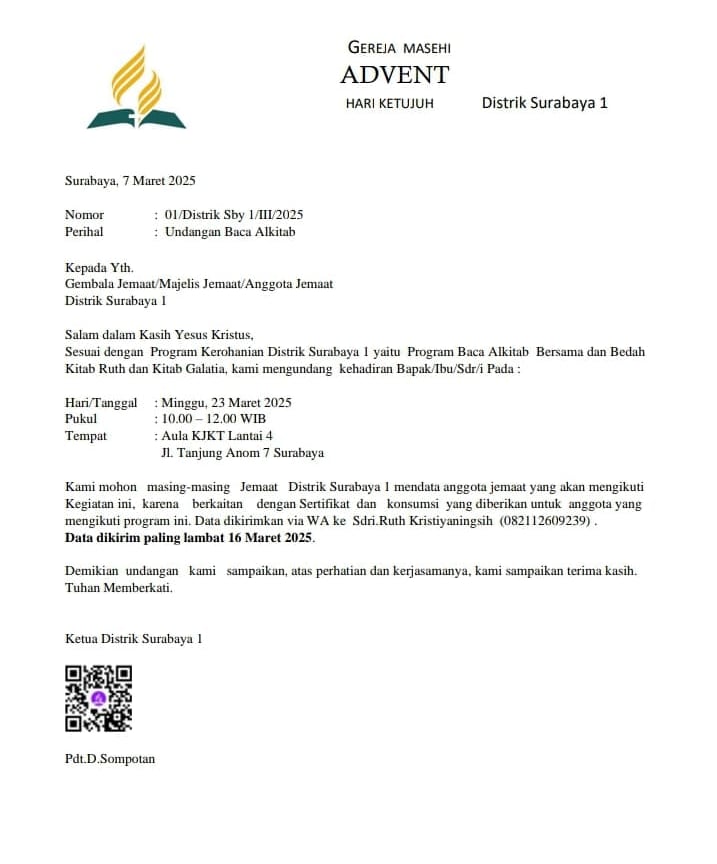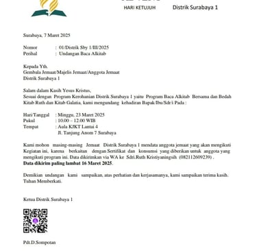 [www.gmahksurabaya1.id] - Semenjak dibahas dan diusulkan dalam Program Kerja tahun 2025 sejak akhir tahun 2024 di rapat pengurus Distrik, kepanitiaan berusaha untuk menemukan metode yang tepat untuk menjalankan acara mengingat ini adalah kebutuhan umat untuk membaca dan menelaah kebenaran Firman Tuhan. Kepanitiaan yang dibentukpun mengadakan beberapa koordinasi dan segera memulaikan serangkaian promosi untuk menghimbau anggota jemaat dapat hadir dalam acara tersebut. Promosi yang dilakukan lewat surat resmi mengundang kepada 8 jemaat yang tergabung di Surabaya 1, juga ada pembuatan poster dan video yang menarik.